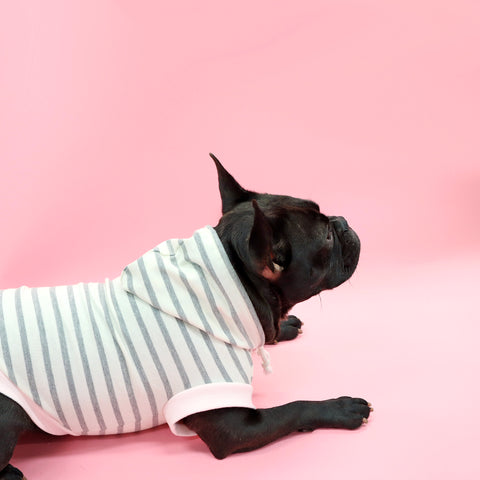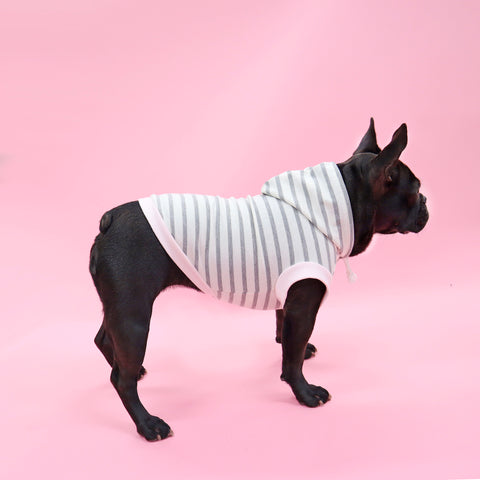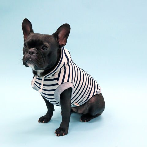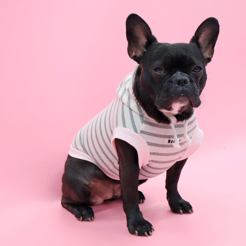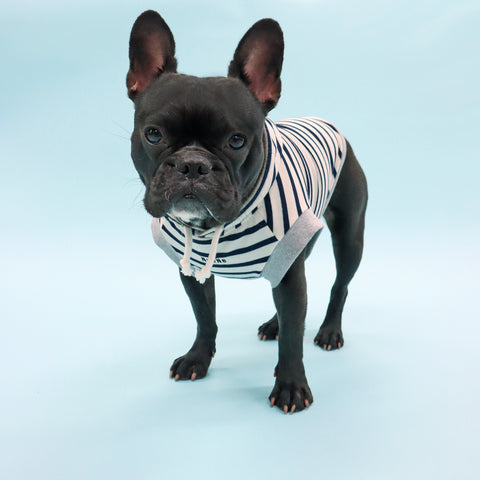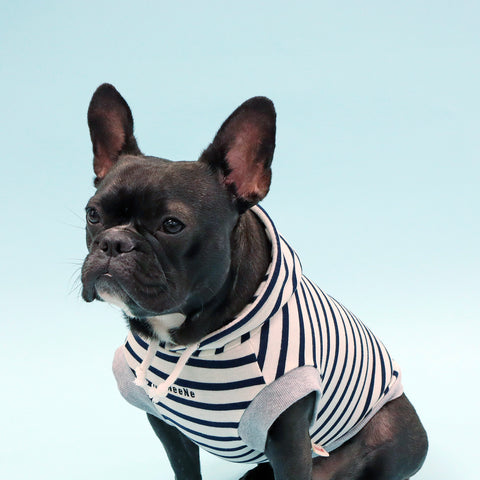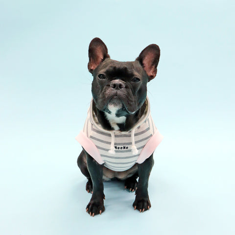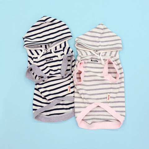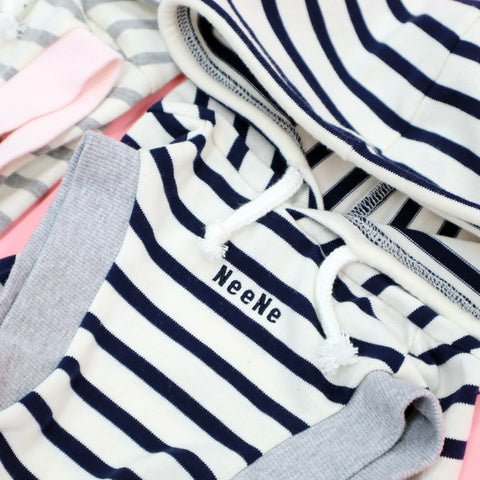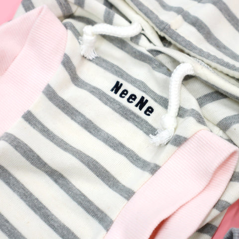 お肌にやさしいコットン100%ボーダーカットソー、ブランドロゴのNeeNeの刺繍を胸に打ち込んだフーディーです。配色のリブがアクセントになっています。百貨店の商品を生産する工場で丁寧に1枚1枚お作りしたお洋服です。